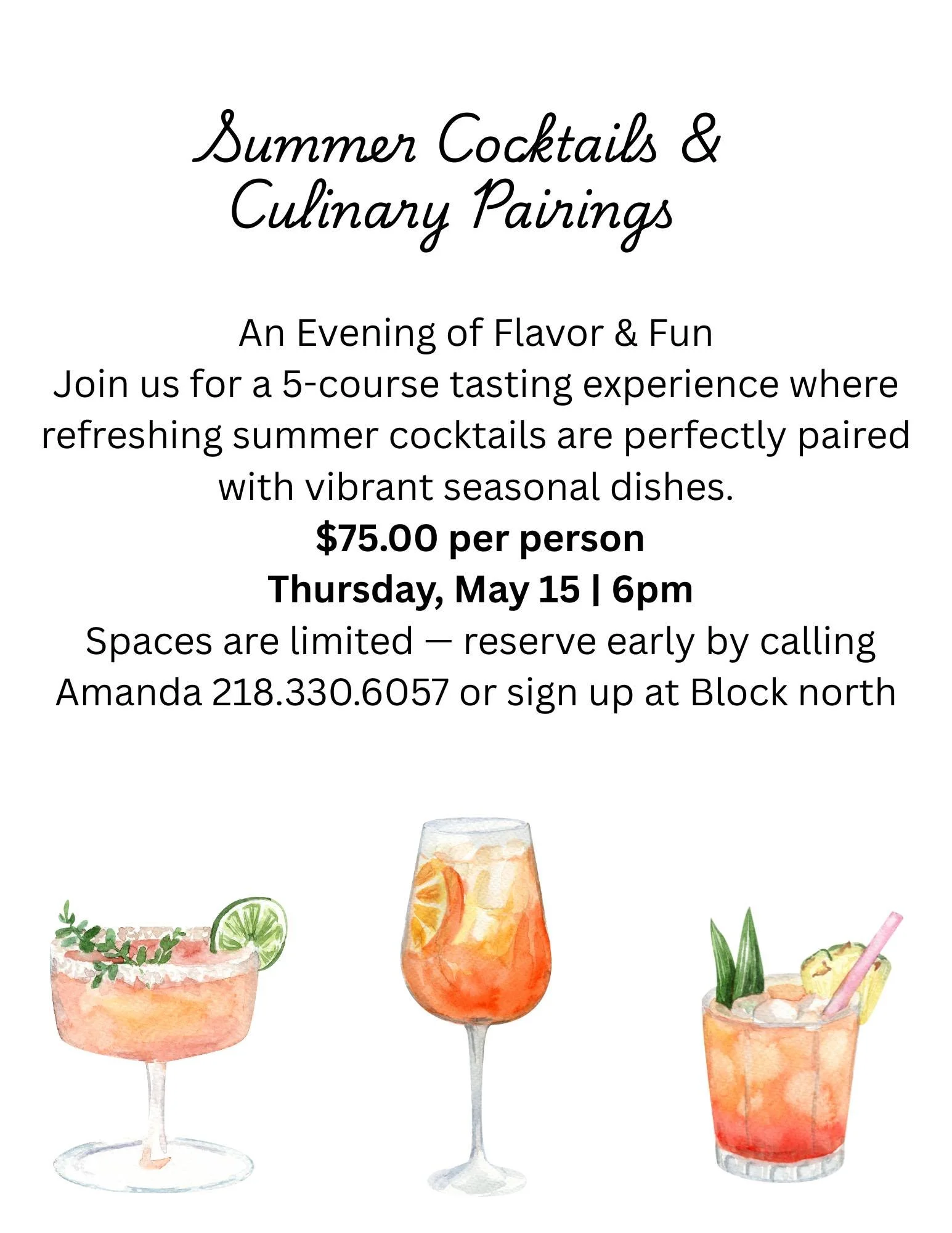 An Evening of Flavor & Fun Join us for a 5-course tasting experience where refreshing summer cocktails are perfectly paired with vibrant seasonal dishes. $75.00 per person Thursday, May 15 | 6pm Spaces are limited — reserve early by calling Amanda 218.330.6057 or sign up at Block north